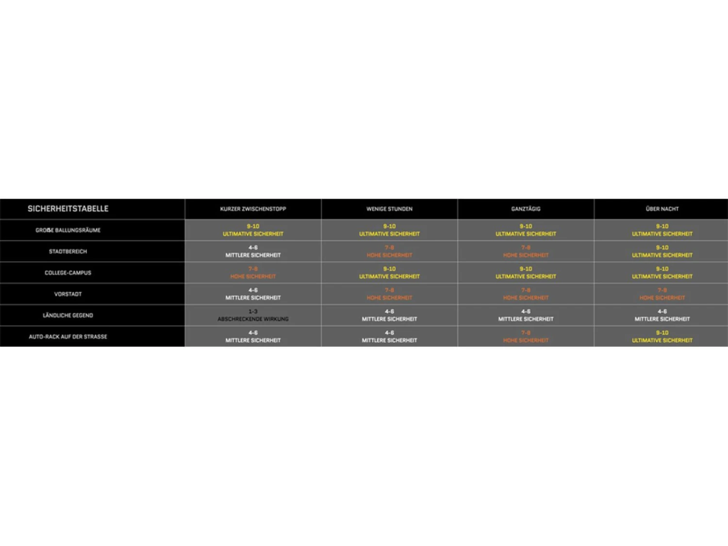 - 10-Punkte-System, bei dem 1 eine Abschreckungswirkung bedeutet und 10 die ultimative Sicherheitsstufe