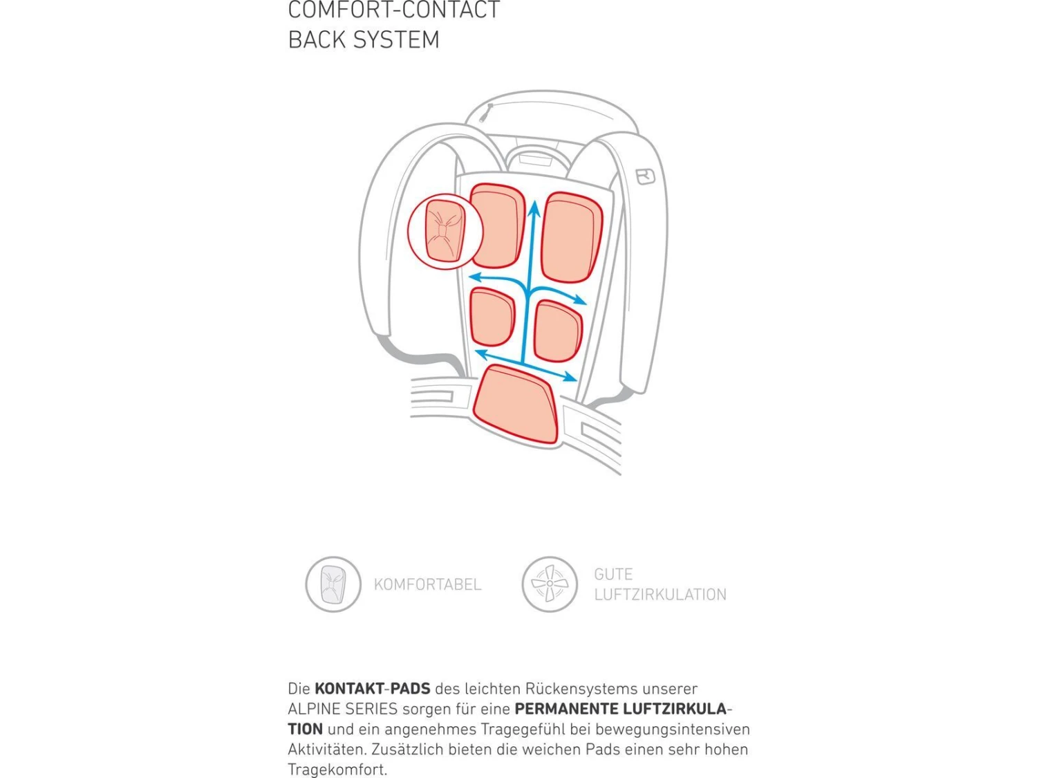 - Comfort-Contact-Back System: Die Kontakt-Pads des leichten Rückensystems unserer Alpine Series sorgen für eine permanente Luftzirkulaion und ein angenehmes Tragegefühl bei bewegungsintensiven Aktivitäten. Zusätzlich bieten die weichen Pads einen sehr hohen Tragekomfort.