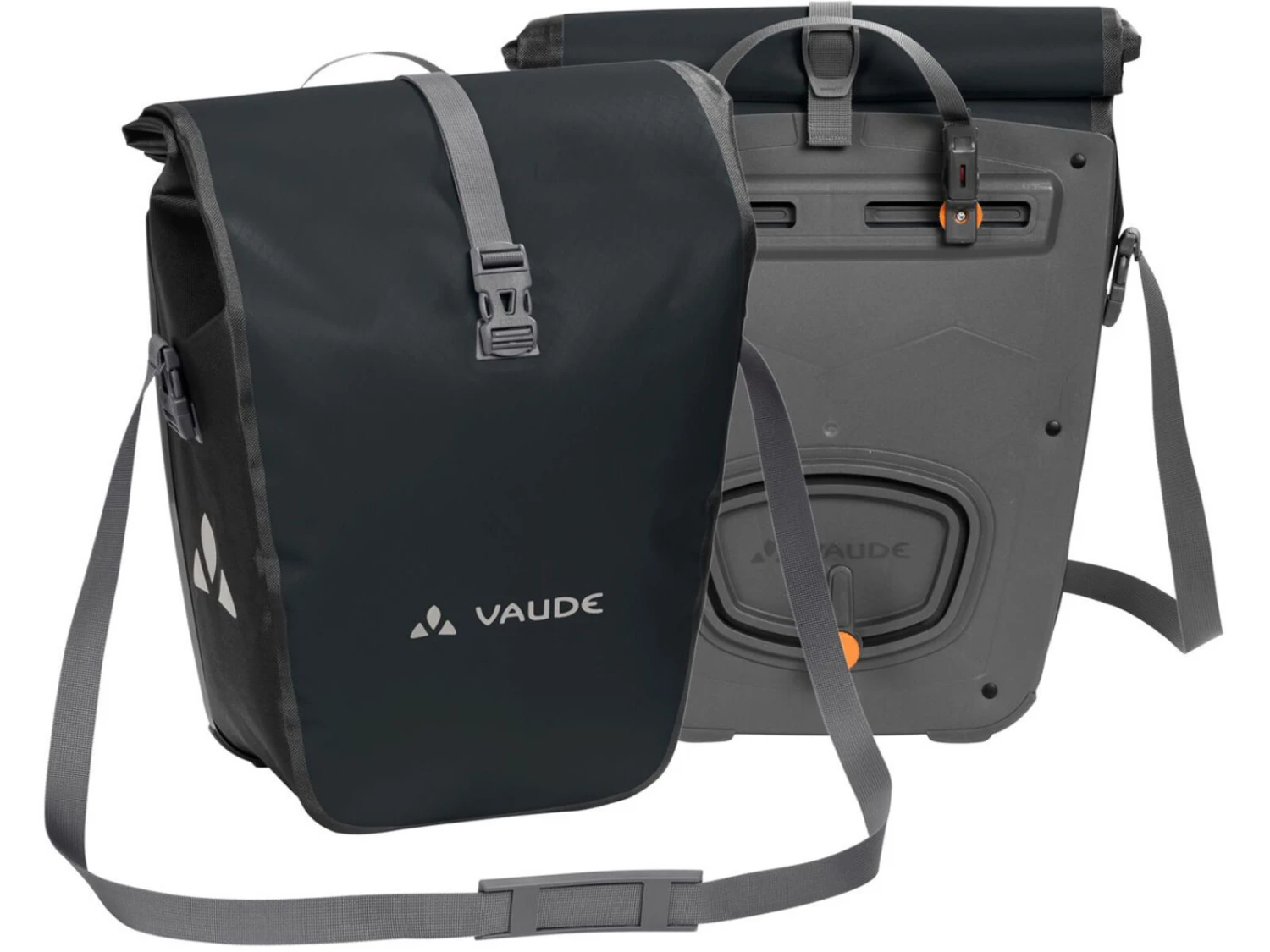 Auf in die große, weite Welt! Die wasserdichten Hinterradtaschen werden aus robustem, PVC-freiem Planenmaterial klimaneutral am deutschen Vaude-Standort in der Nähe des Bodensees hergestellt und würden gerne mit Dir auf große Reisen gehen. Sie lassen sich durch den Wickelverschluss auf individuelle Größen bringen und absolut dicht verschließen. Für Übersichtlichkeit sorgt eine einfache Innentasche. Die Radtaschen werden mit dem QMR 2.0-System und stabiler Rückenplatte rechts und links am hinteren Gepäckträger befestigt, sind über einfach bedienbare Handrädchen justierbar und lassen sich schnell und einfach abnehmen. Mit einem Fahrradschloss können sie direkt am QMR-Haken verriegelt werden. Reflexelemente sorgen für eine gute Sichtbarkeit im Straßenverkehr. Lieferumfang: zwei Taschen (Paar). Kann durch diese praktischen Zubehör-Taschen ergänzt werden: Toolbag Back, Sortyour Back, Addita Bag.Features